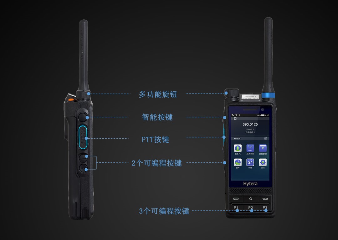 延續專網用戶一鍵操作便捷高效的操作習慣,PDC680/ PTC680系列具備多個專用旋鈕和按鍵,橢圓形的PTT按鍵觸感舒適,反應靈敏,保證客戶在緊急情況下能時刻應答;頂部專用緊急報警鍵從任何角度都可一觸即發;智能按鍵根據業務場景實現不同功能,如一鍵視頻通話、一鍵錄像/錄音、快速切換聯系人、快速切換信道等。5個可編程按鍵支持長按、短按和雙擊操作,可配置多個功能指令,滿足對不同業務的快捷操作需求,例如可以設置一鍵發起呼叫功能,快捷高效;多功能專用旋鈕默認用于調節音量,按下后可進行信道或聯系人切換。